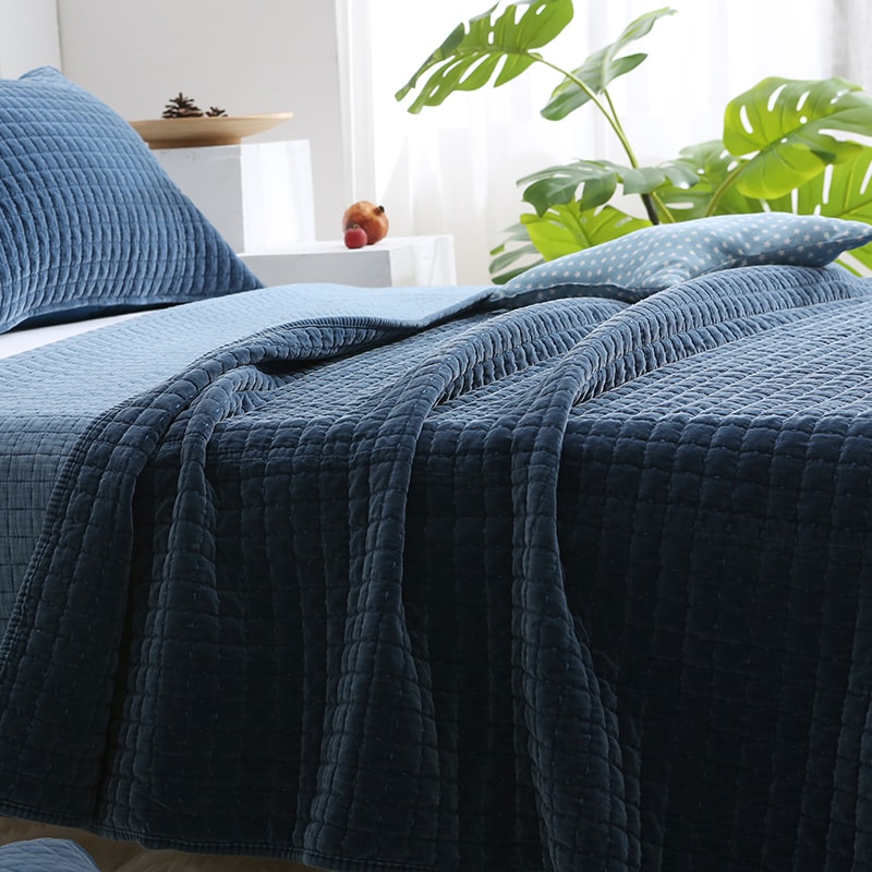 ผ้านวมสีทึบที่นุ่มและหรูหรานี้ทำจากกำมะหยี่โพลีเอสเตอร์ ดีไซน์ควิลท์ลายเพชร ผ้านวมมีแผ่นรองหลังผ้าฝ้ายสีเข้ากัน เลือกอัลมอนด์ อำพัน เทาเข้ม นกเป็ดน้ำเข้ม องุ่น หรือครีมอ่อน ไส้ในเป็นโพลีเอสเตอร์ ซักเครื่องได้